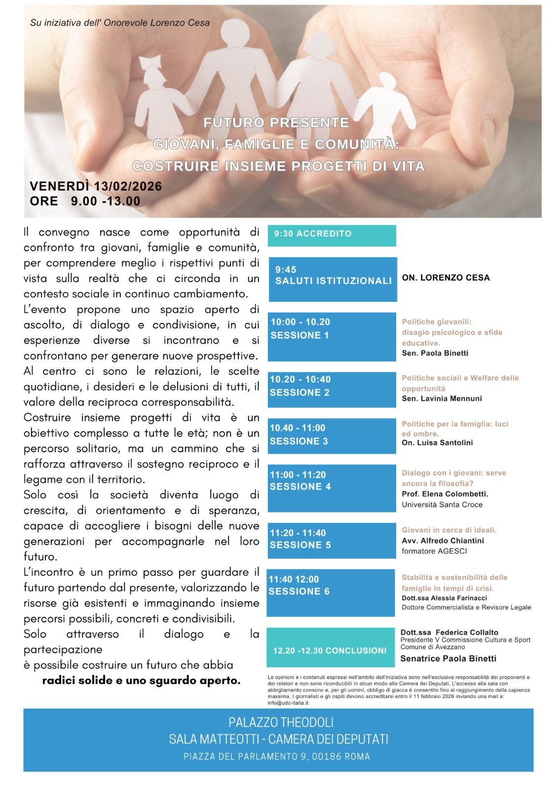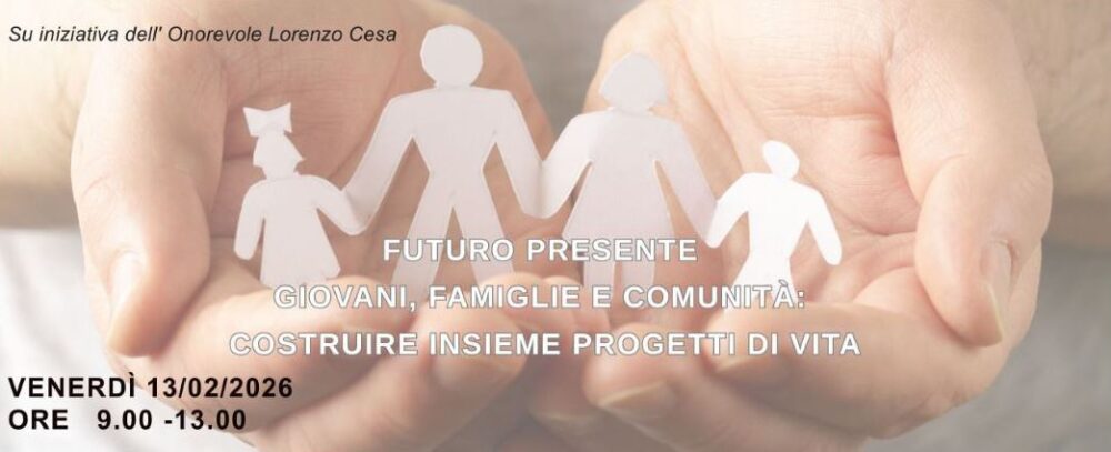 Si terrà venerdì 13 febbraio, a Roma, presso Palazzo Theodoli, Sala Matteotti – Camera dei Deputati, il convegno dal titolo “Futuro presente: giovani, famiglie e comunità – costruire insieme progetti di vita”, promosso dall’UDC territoriale di Avezzano e organizzato dalla coordinatrice cittadina Federica Collalto.