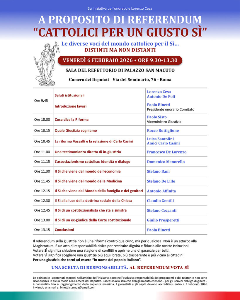 Un contributo particolarmente significativo è arrivato dalla sen. Paola Binetti, presidente onoraria del Comitato Cattolici per un giusto Sì, che ha aperto e concluso i lavori richiamando con forza il valore della giustizia come servizio alla persona, fondamento dello Stato di diritto e pilastro imprescindibile della democrazia.